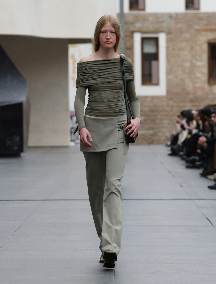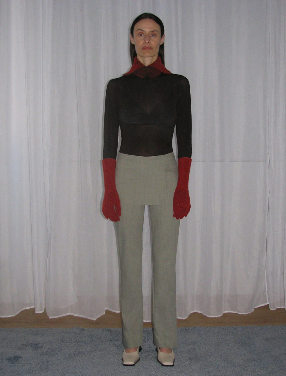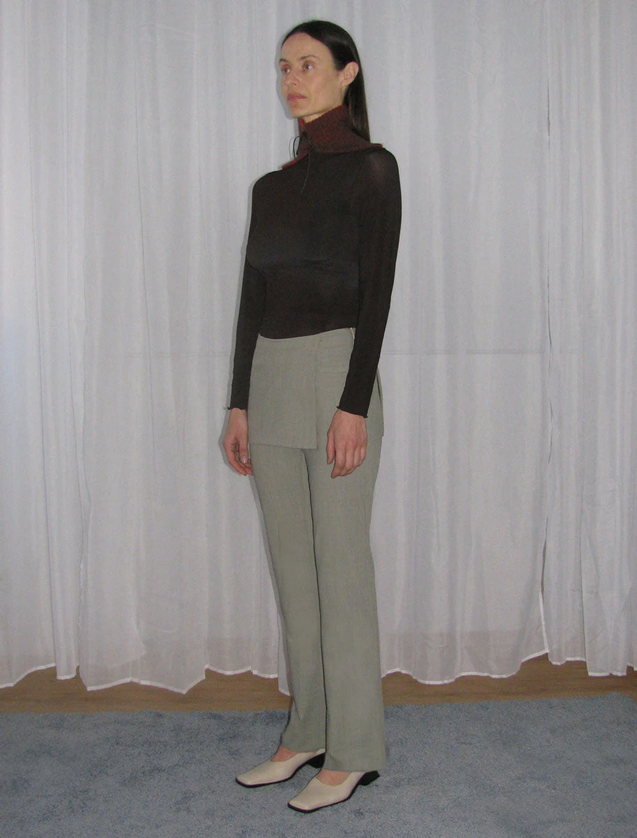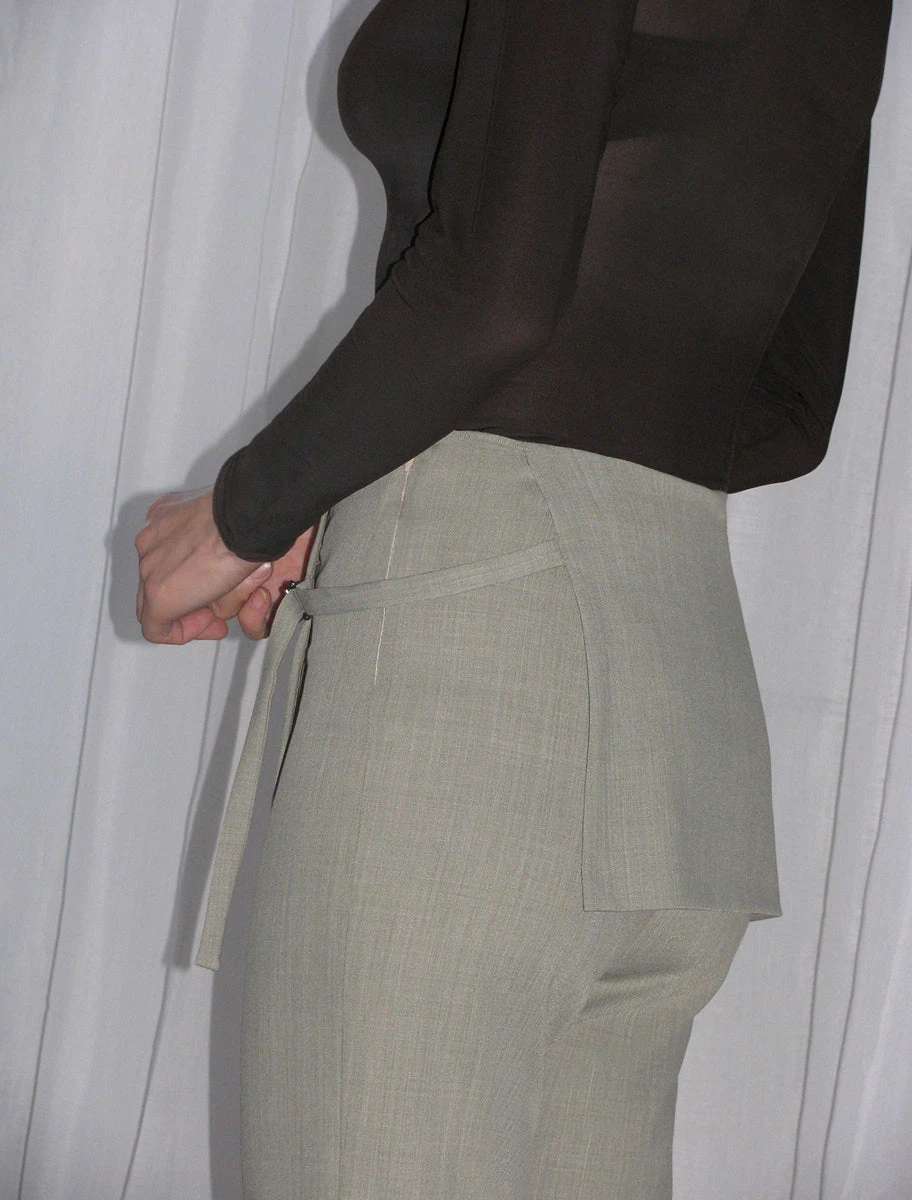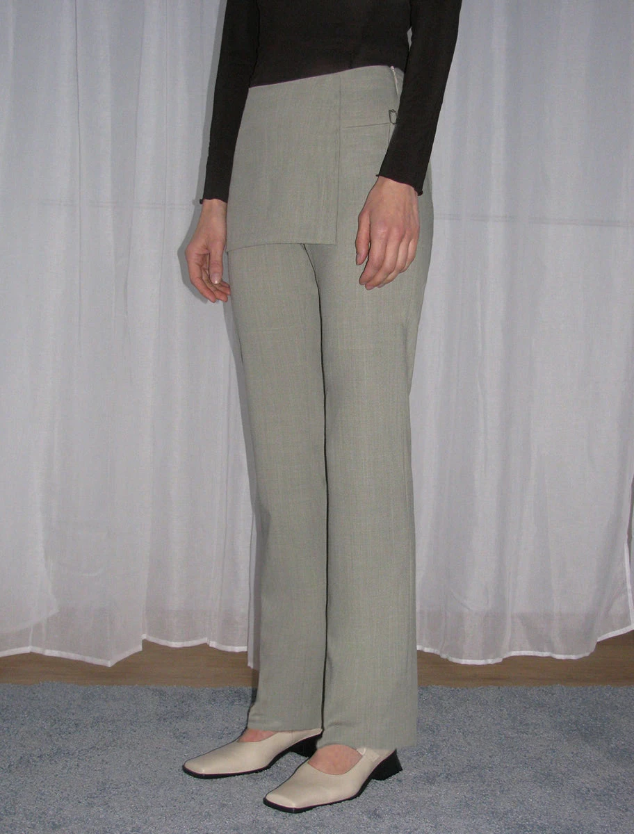 Straight leg, mid-rise pants with overlapping short fixed mini hip skirt (not removable). Color light khaki.