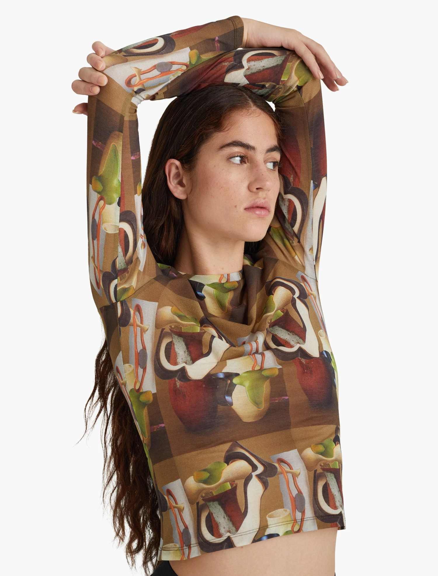 Light and slightly sheer fabric, long-sleeved, round neck T-shirt.