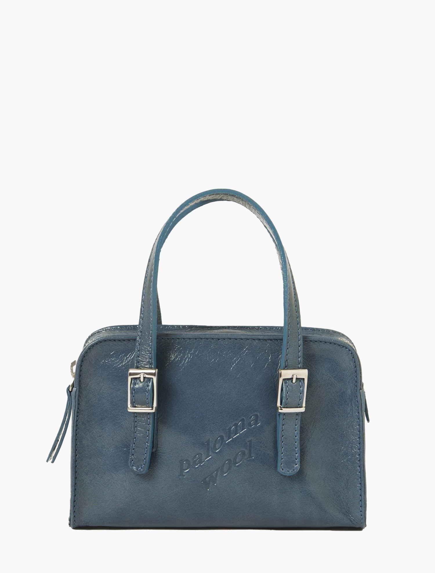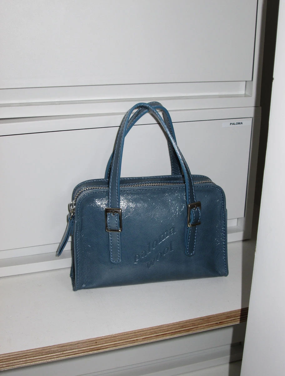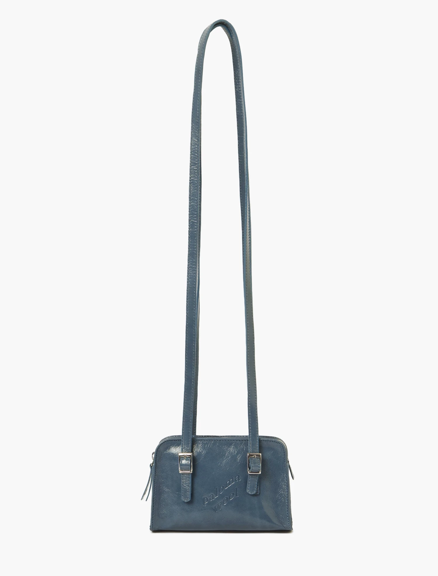 Shiny leather bag with engraved logo. Inside pocket. Smaller version of the Cayetano bag. Color greyish blue.