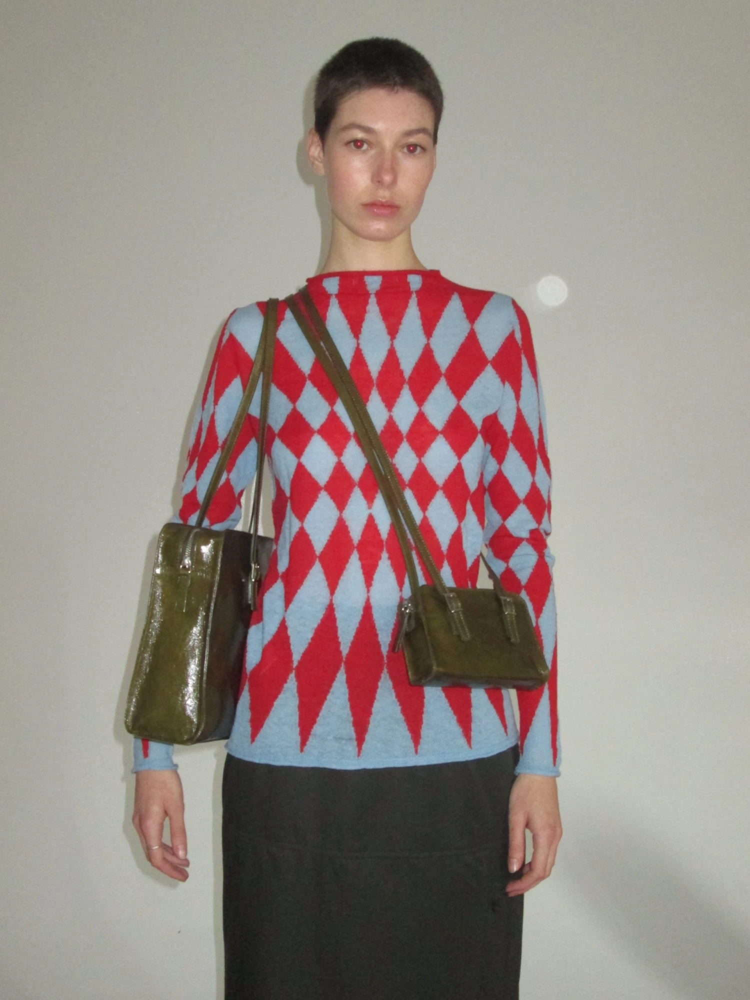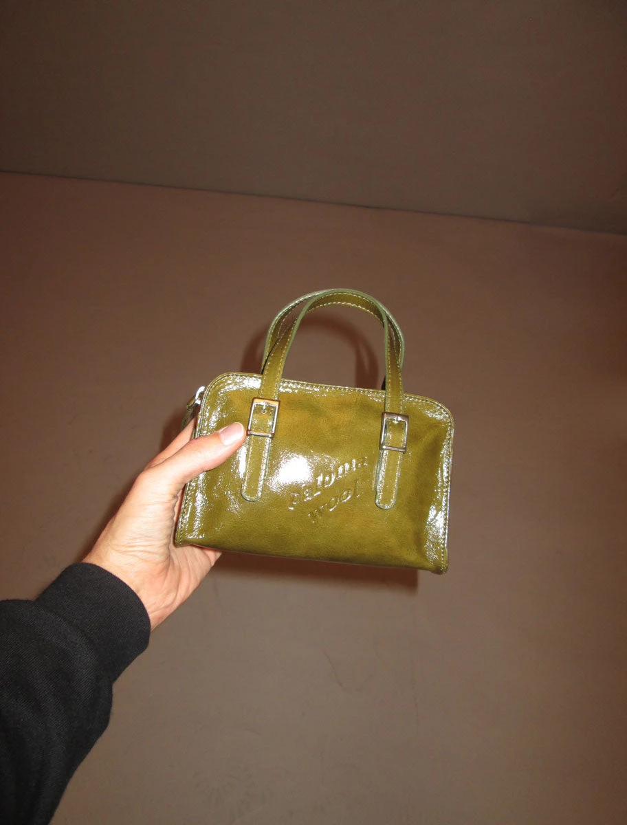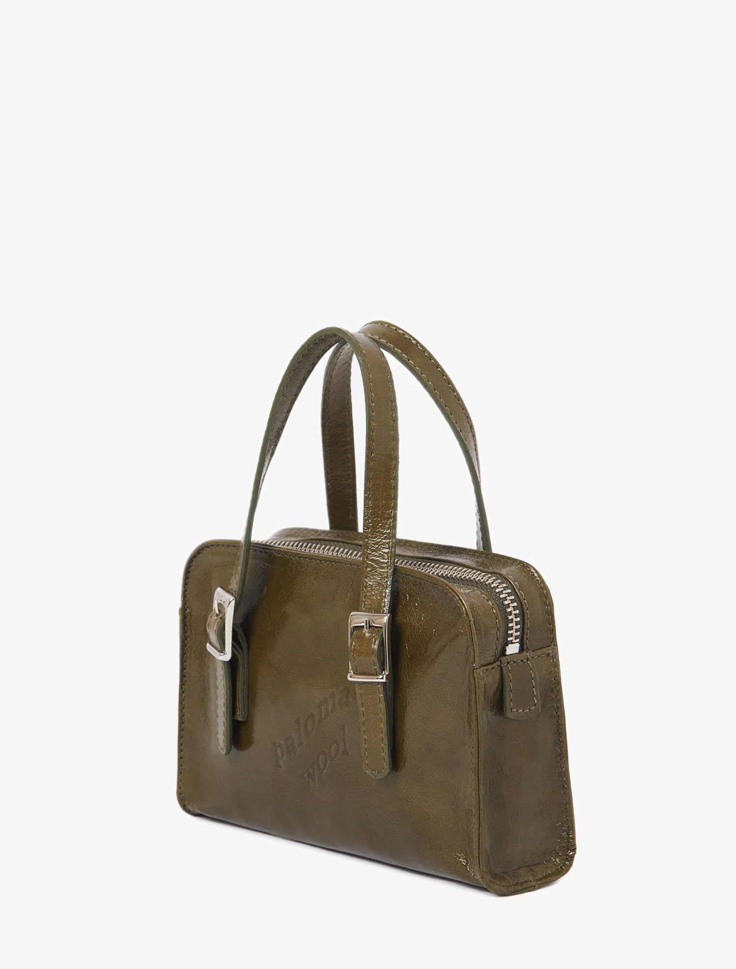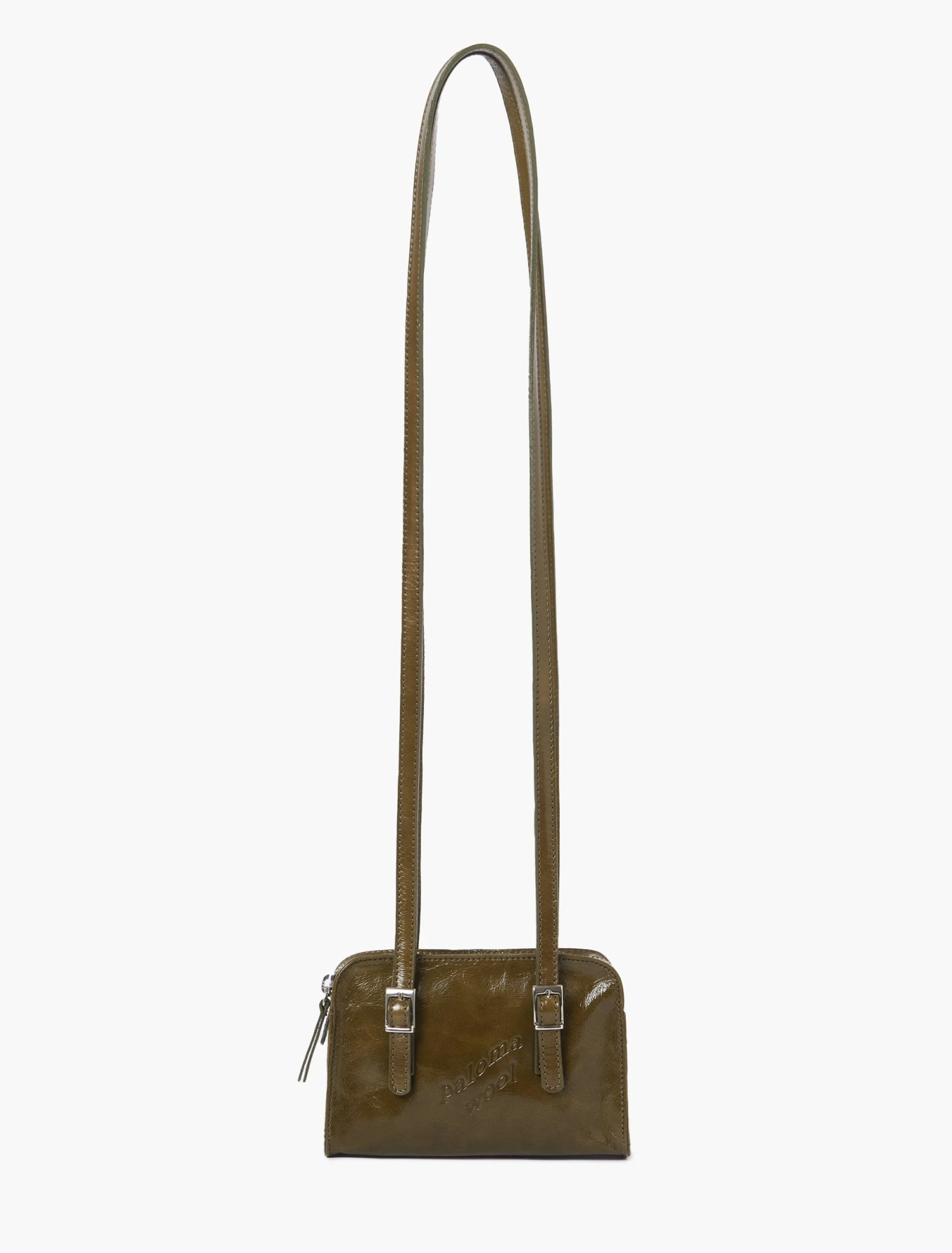 Shiny leather bag with engraved logo. Inside pocket. Smaller version of the Cayetano bag. Color khaki.