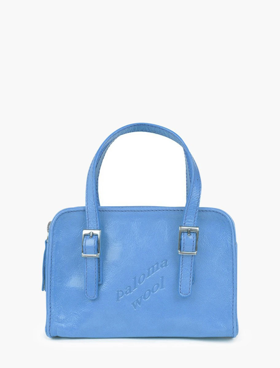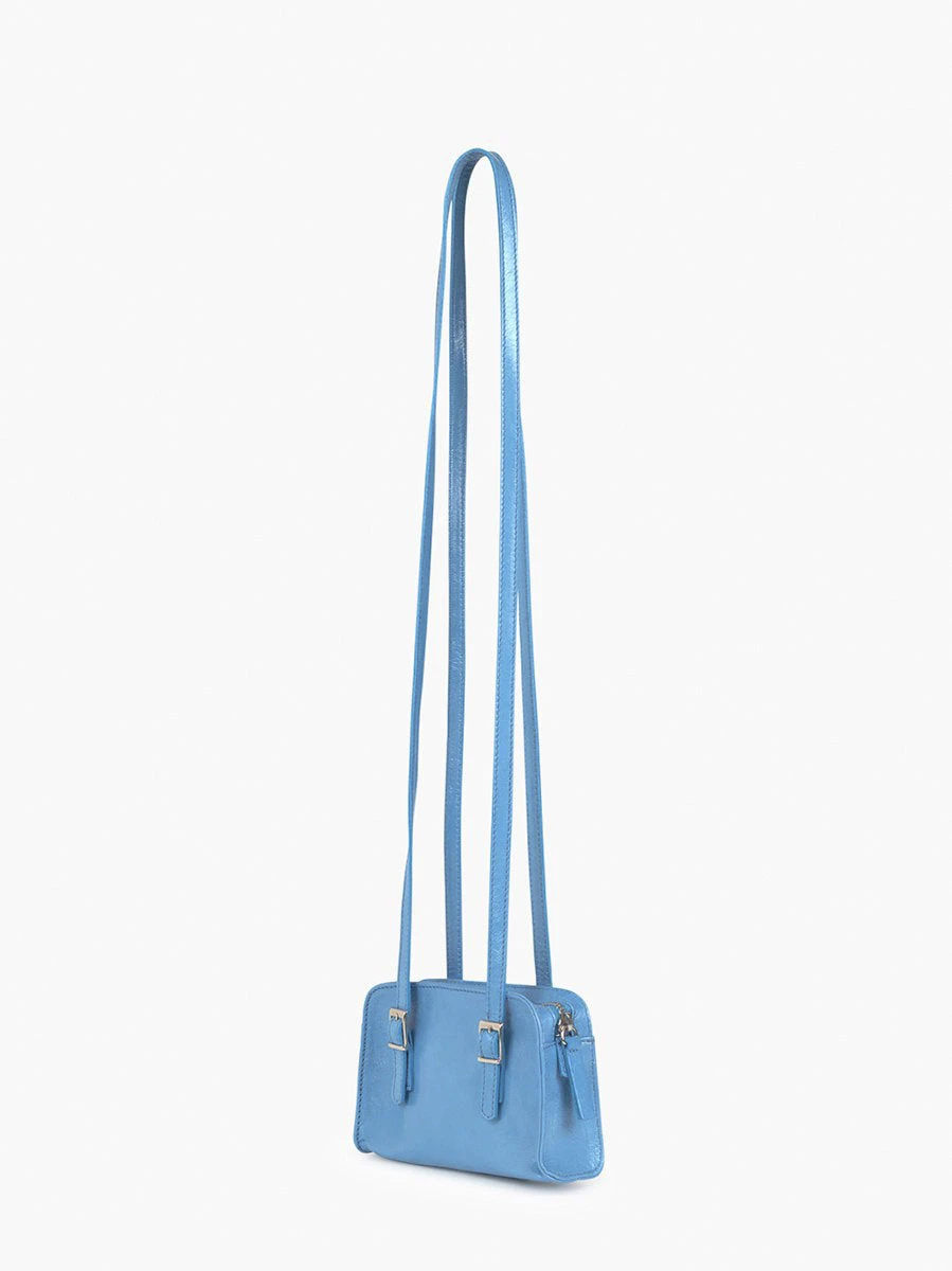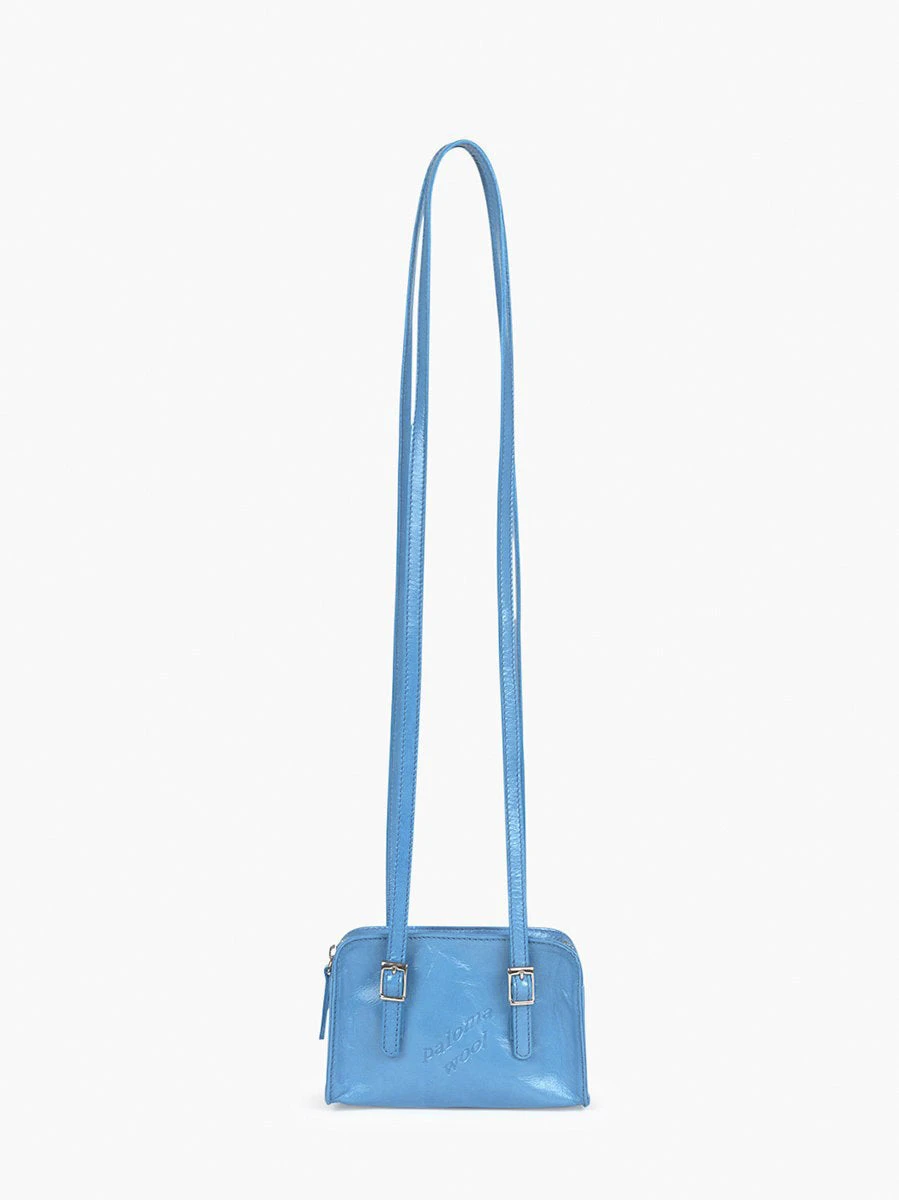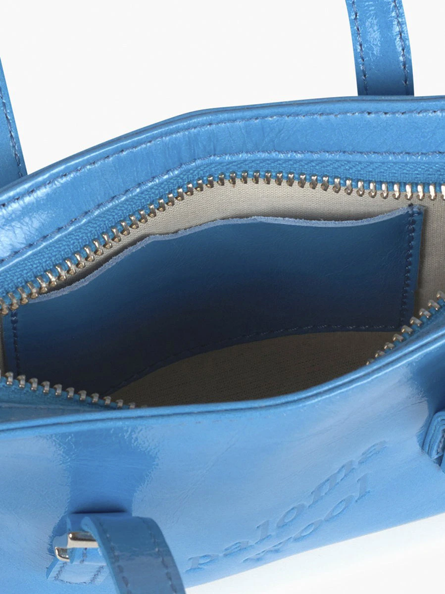 Shiny leather bag with engraved logo. Inside pocket. Smaller version of the Cayetano bag. Color light blue.