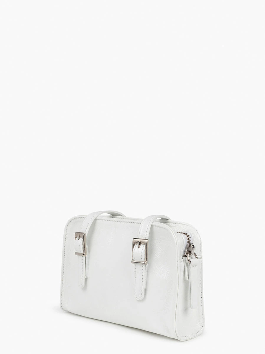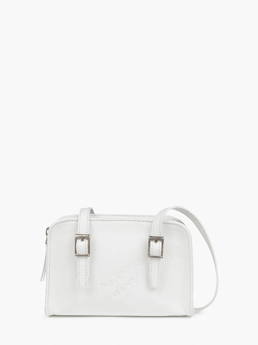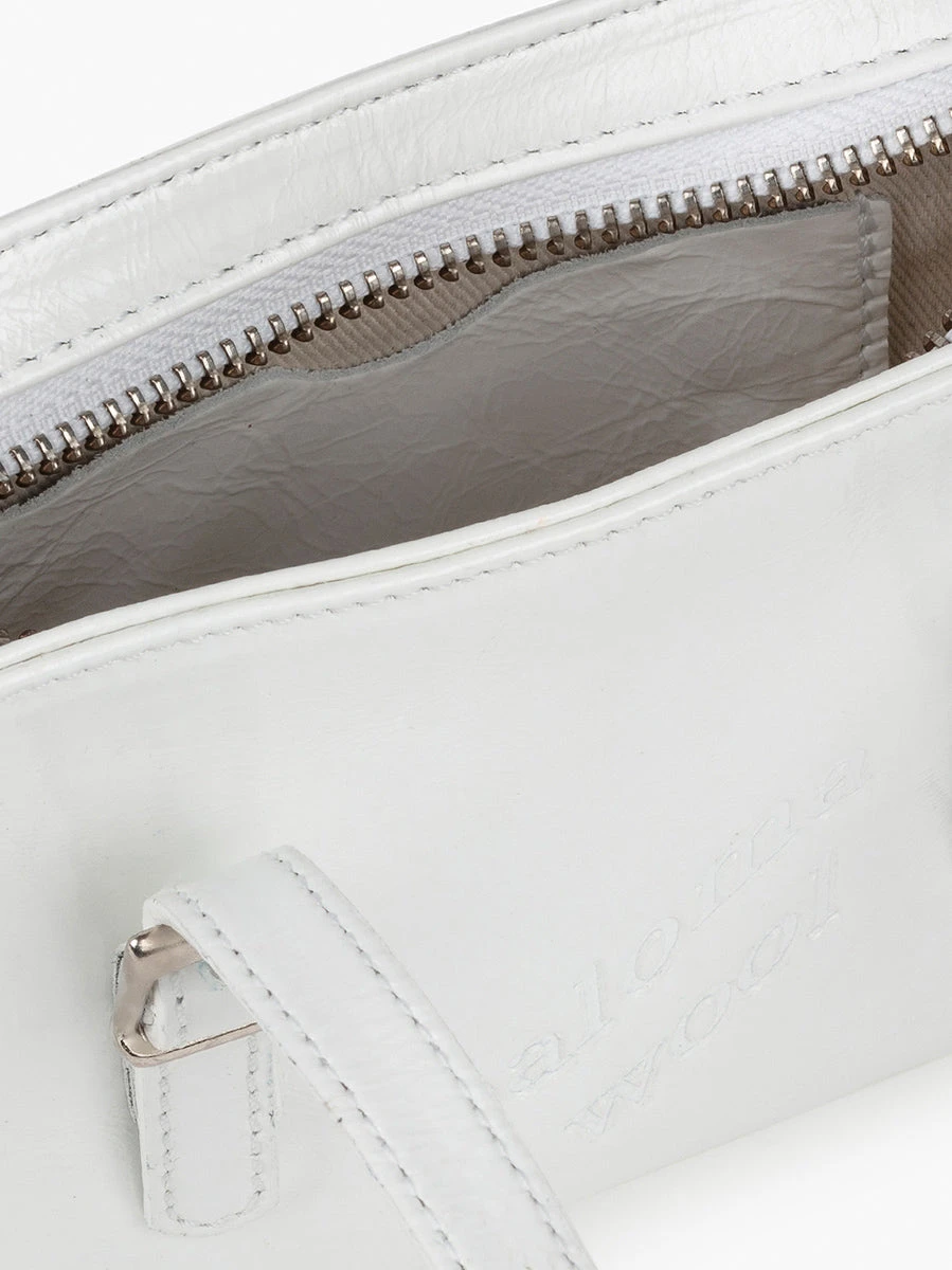 Shiny leather bag with engraved logo. Inside pocket. Smaller version of the Cayetano bag. Color white.