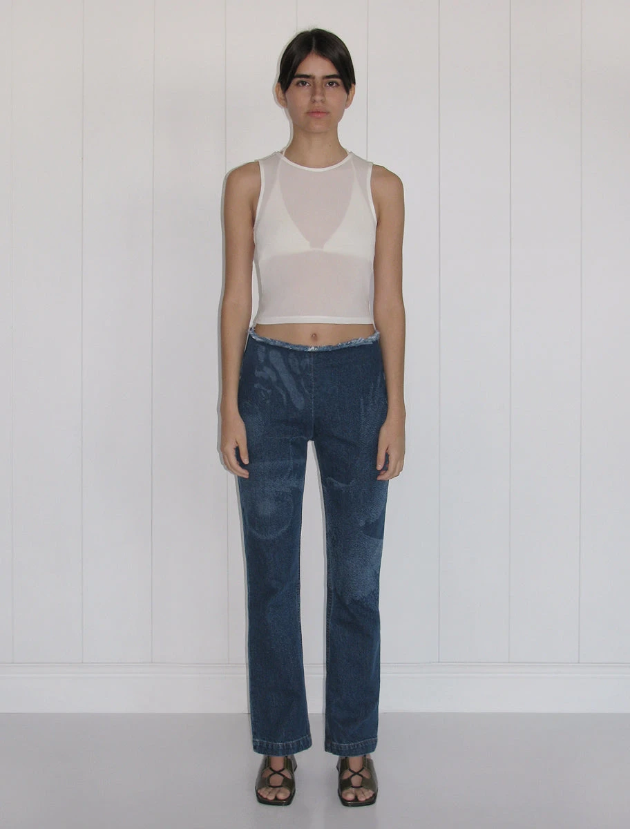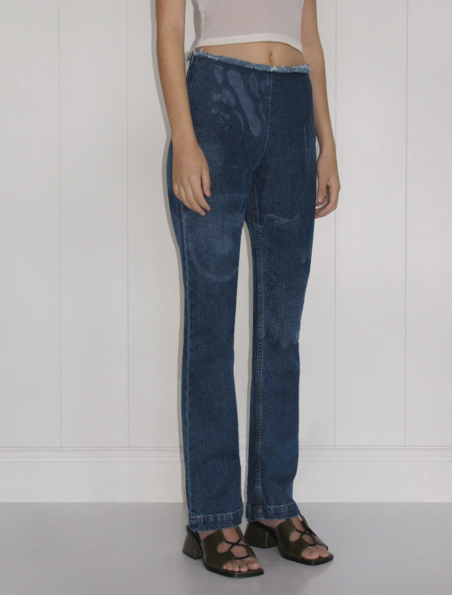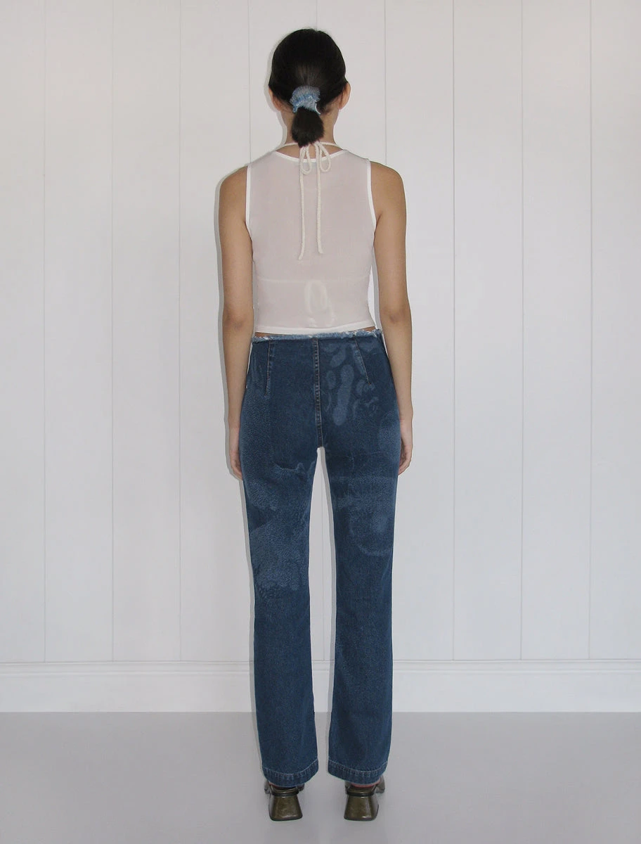 Straight leg, mid-rise torn laser print denim pants.