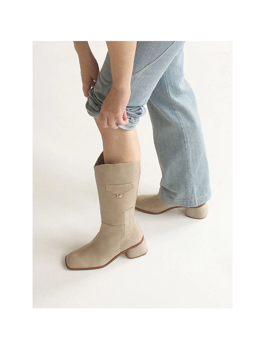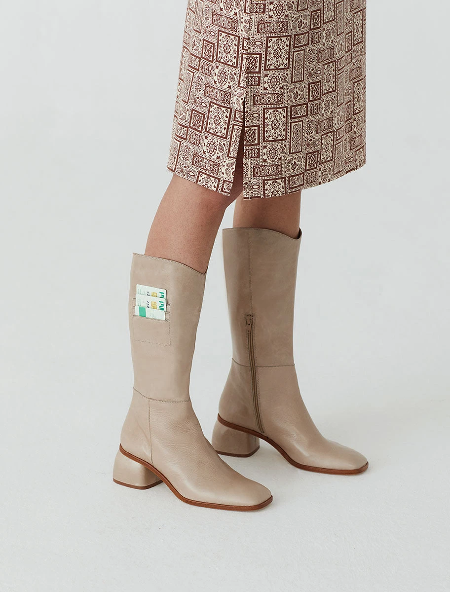 High leather boots. Lined leather heel. Pockets and card holder details.
