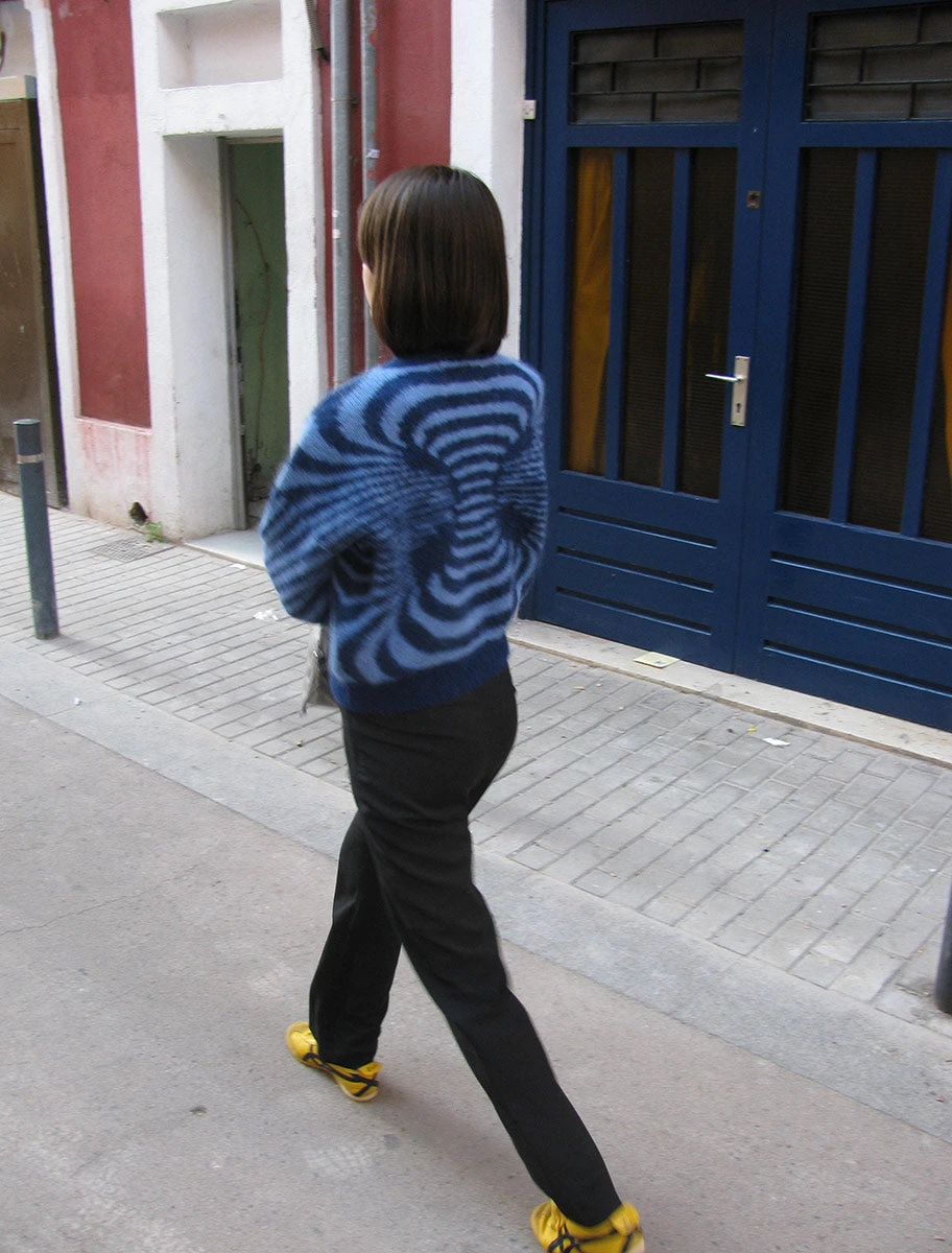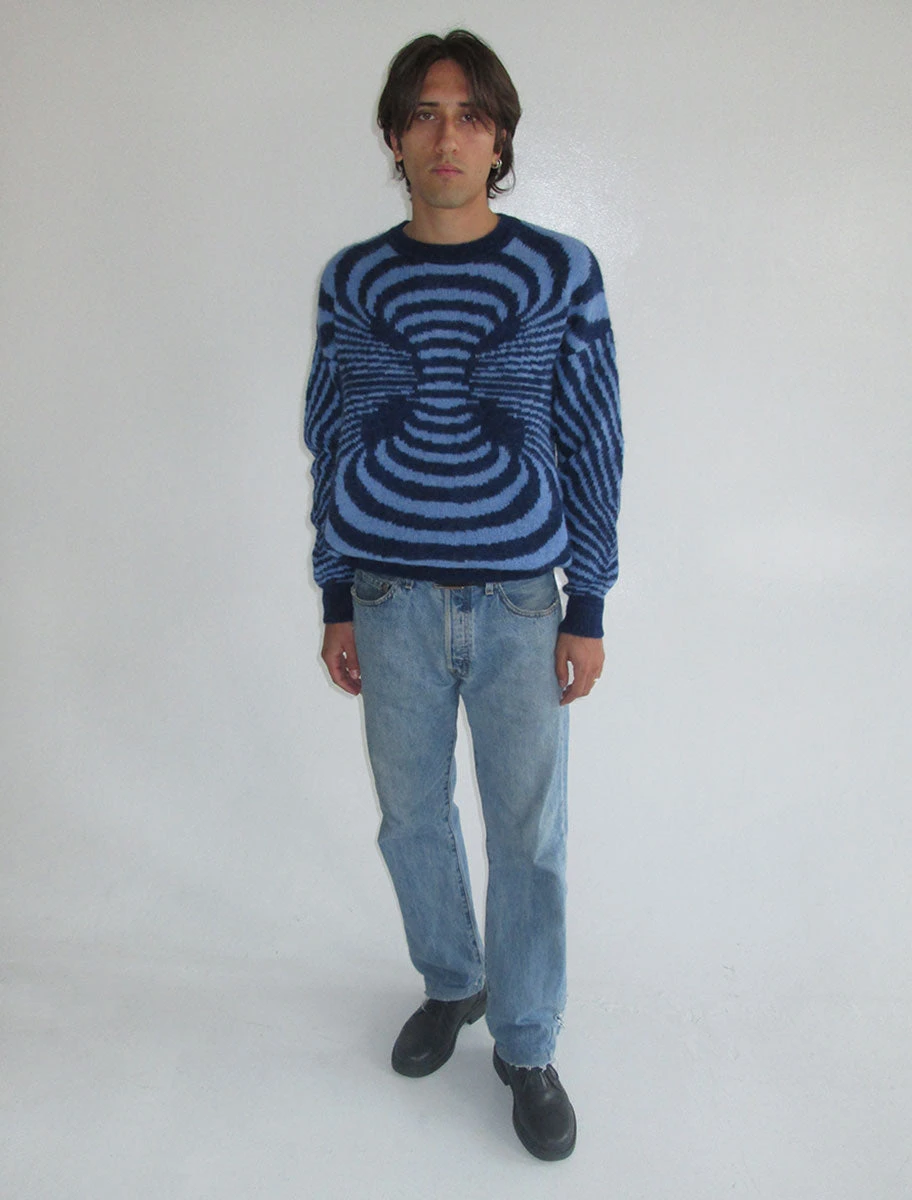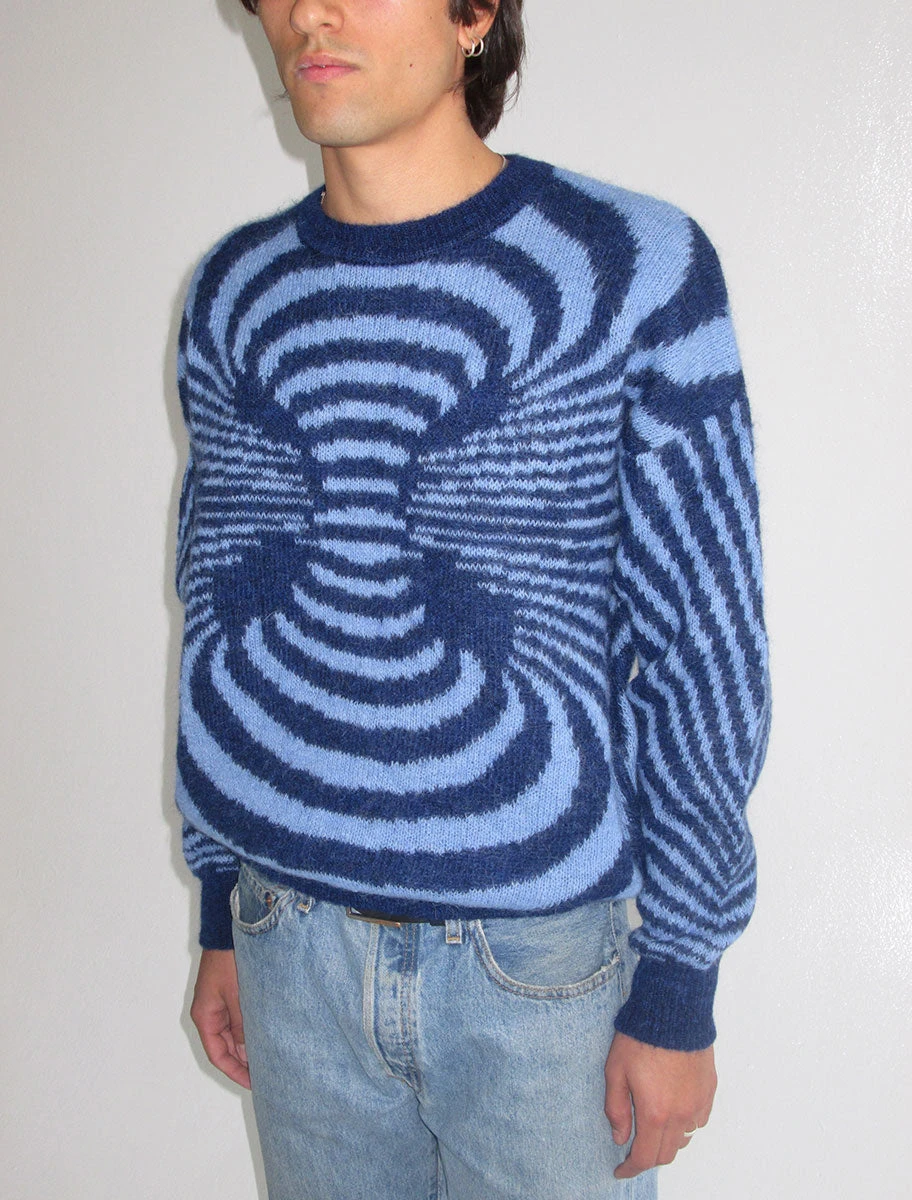 Warm and fuzzy infinite Op-art sweater. Available in 4 different color options. Color navy.