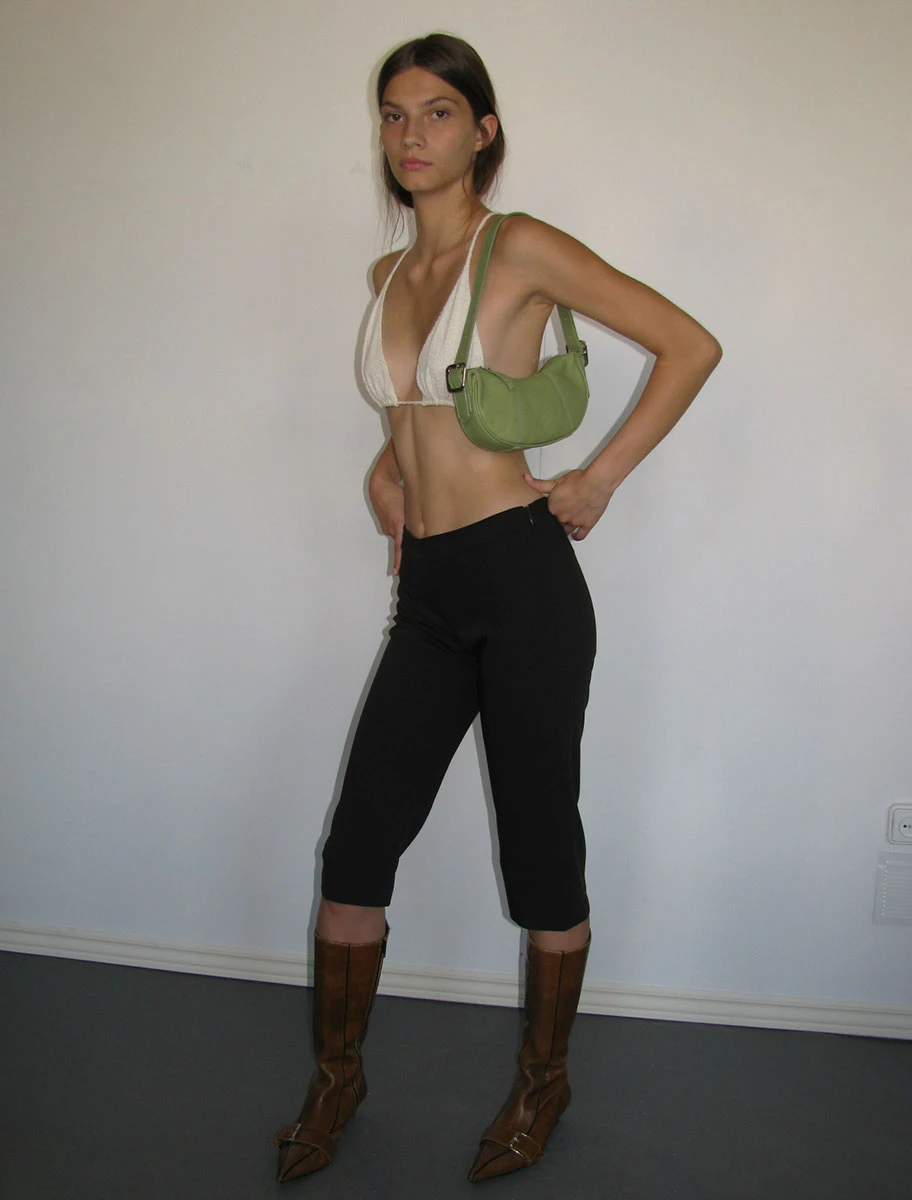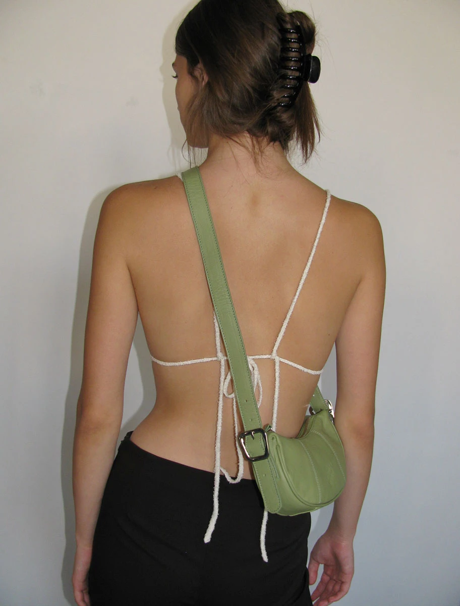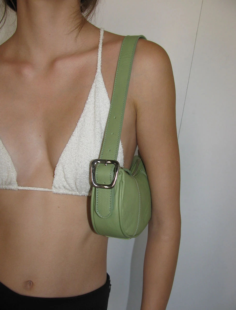 Leather mini bean-shaped bag with embossed paloma wool logo. Color light green.