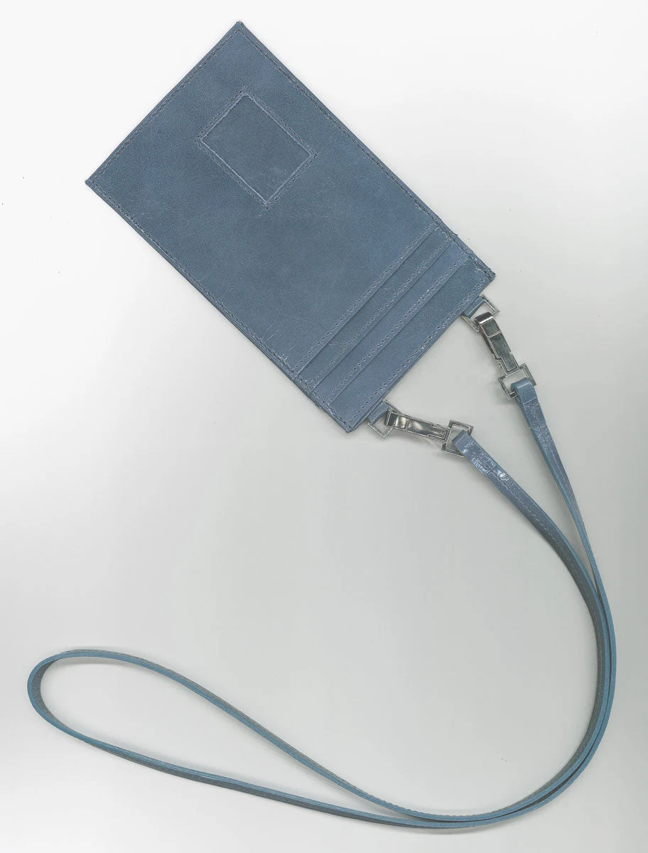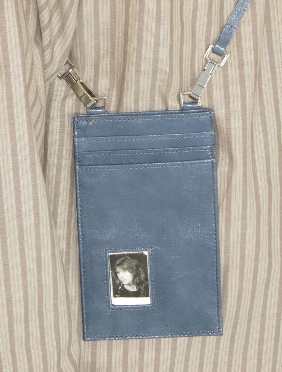 Card holder bag with space for the mobile. You can carry it hanging or you can remove the strip as a card holder. Space to put the photo of your favorite person. Color greyish blue.