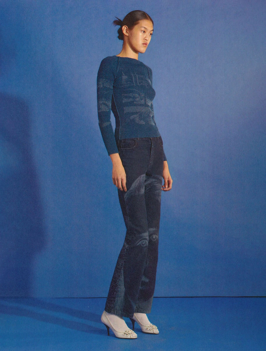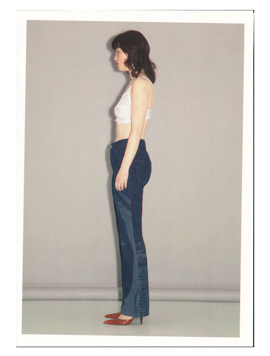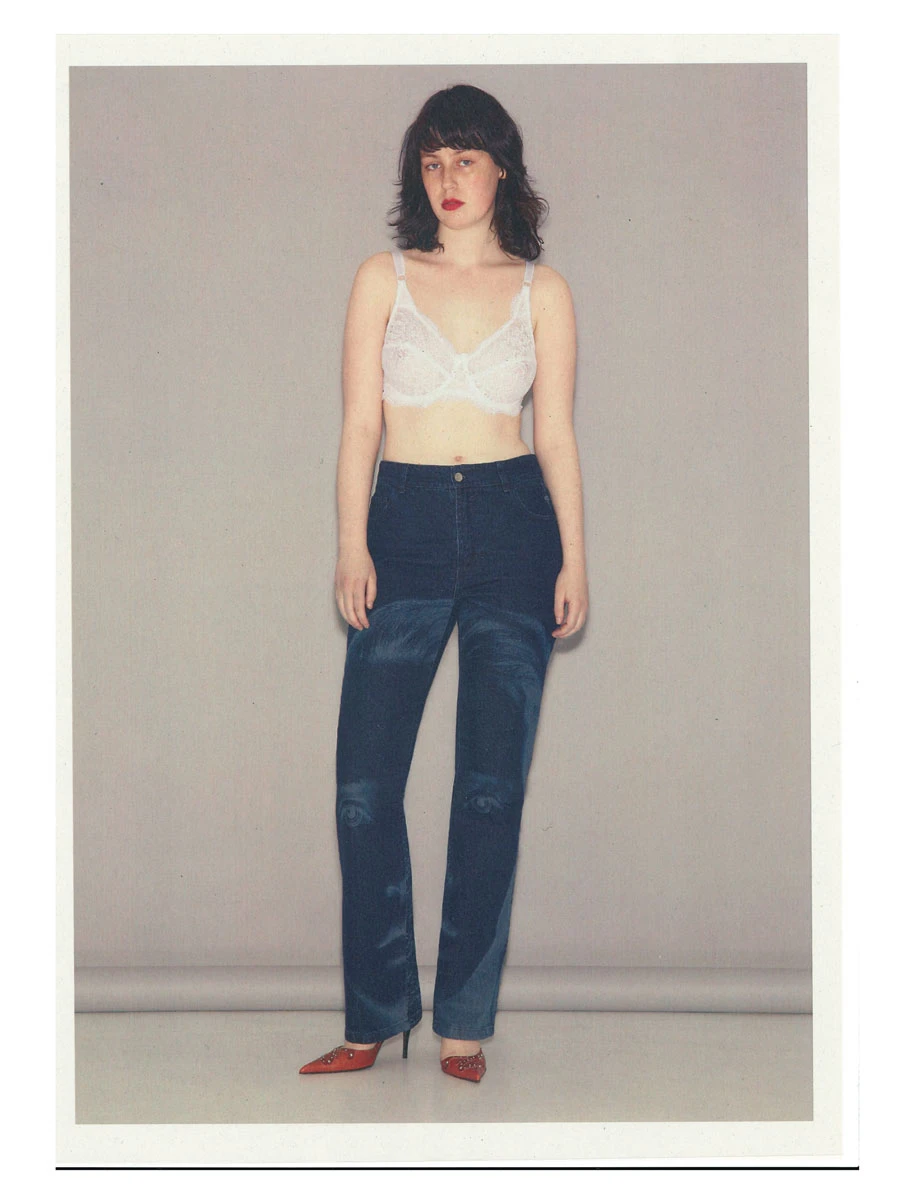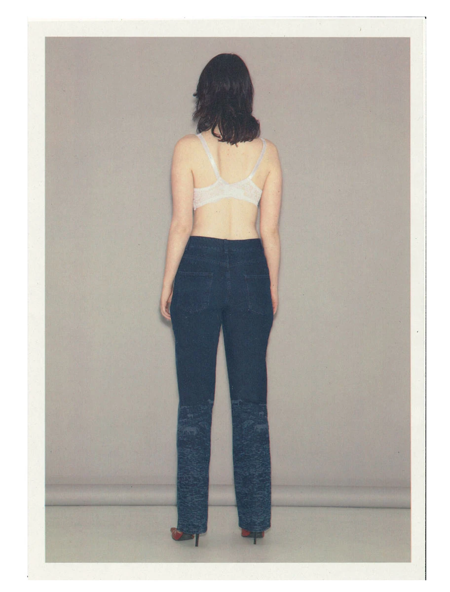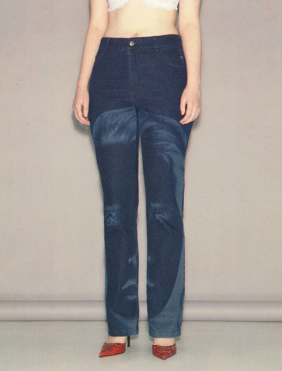 Straight leg, mid-waist, laser printed portrait of our friend Vida Adamczewski in the front, and laser print images of horses from the island of Menorca on the back.